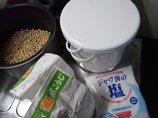 | 秋田の有機大豆 新潟の生米こうじ 自然食品で購入した天日塩 |